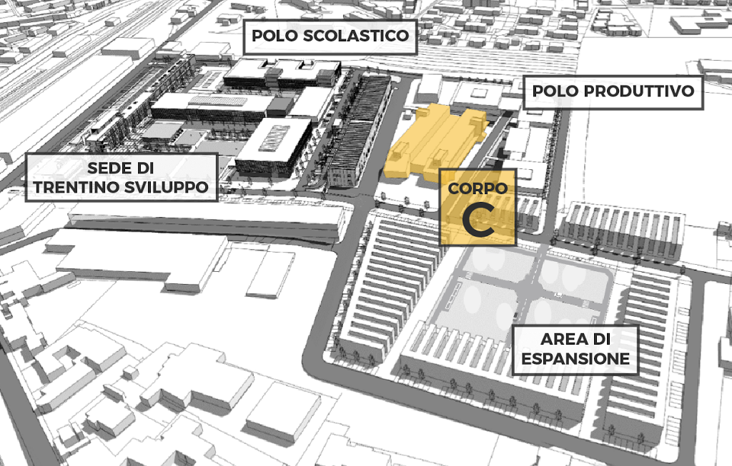 I moduli produttivi del nuovo edificio sono finiti ma, considerati i numerosi interessamenti, Trentino Sviluppo ha ricavato altri 1.000 metri quadrati di spazi ufficio nel Corpo C (vedi immagine).