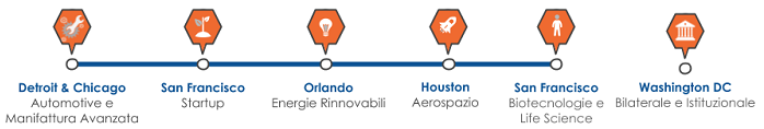 Il progetto si sviluppa in una serie di iniziative settoriali in altrettante aree strategiche degli Stati Uniti in programma tra giugno 2018 e gennaio 2019: cinque "Innovation Days" dedicati a incontri tra imprenditori e seminari di approfondimento con focus sull'Industria 4.0. Le tappe previste sono Detroit, San Francisco, Orlando, Huston, nuovamente San Francisco e Washington.