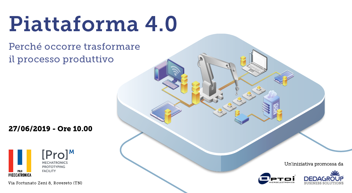 Data:"Piattaforma 4.0 - Perché trasformare il processo produttivo" è l'evento di approfondimento che inaugura la nuova collaborazione della ProM Facility di Trentino Sviluppo con Dedagroup Business Solutions e Optoi, andando così ad espandere la piattaforma di Industry 4.0 di Polo Meccatronica. L'appuntamento è per giovedì 27 giugno a partire dalle ore 9.30 presso la sede di Trentino Sviluppo a Rovereto in via Zeni 8.