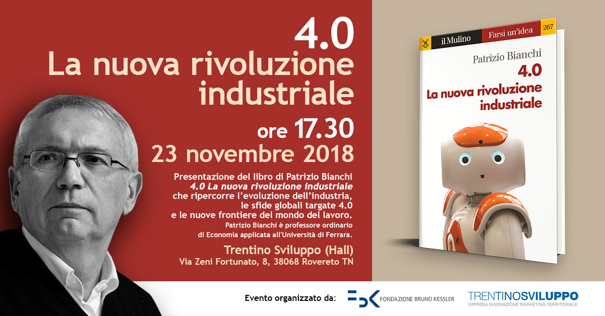 Venerdì 23 novembre alle ore 17:30 ospitiamo nella hall di Trentino Sviluppo un evento di presentazione di un libro sull’Industria 4.0, organizzato in collaborazione con la Fondazione Bruno Kessler.